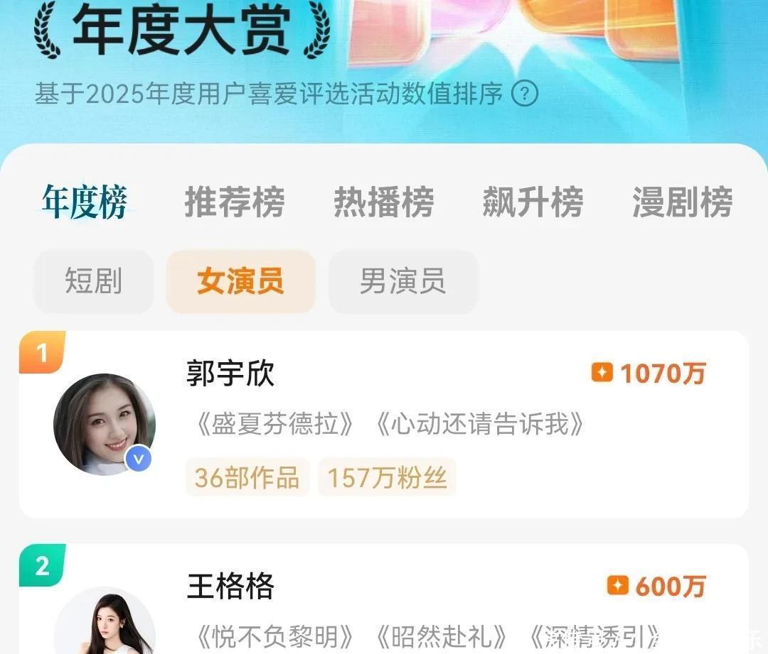 她主演的《盛夏芬德拉》播放量狂破50,成功包揽剧集榜和演员榜双冠,红果年度大赏以1070万票断层登顶,比第二名多了470万票,实力碾压全场。